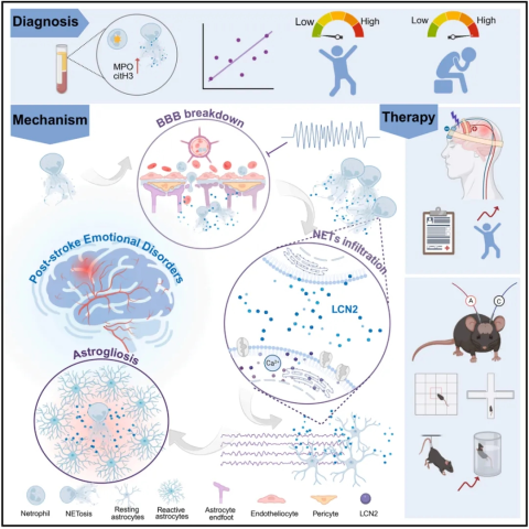 该研究揭示了外周免疫系统与中枢神经系统之间的跨血脑屏障的交互机制,确定了中性粒细胞外诱捕网(NET)释放的脂质运载蛋白-2(Lcn2)在卒中后情绪障碍(PSED)发病中的关键作用,而经颅直流电刺激(tDCS)通过抑制 Lcn2 的释放来缓解 PSED。