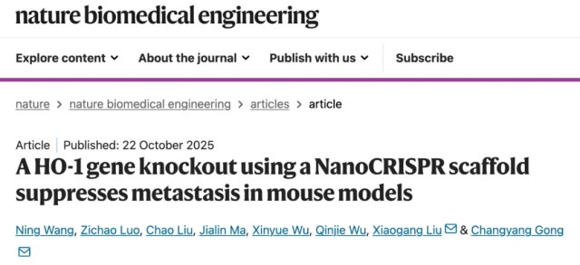 原文出处:Wang N, Luo Z, Liu C, Ma J, Wu X, Wu Q, Liu X, Gong C. A HO-1 gene knockout using a NanoCRISPR scaffold suppresses metastasis in mouse models. Nat Biomed Eng. 2025 Oct 22. doi: 10.1038/s41551-025-01518-1. Epub ahead of print. PMID: 41125868.
