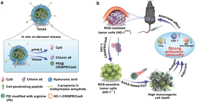 该研究开发了一种基于 CRISPR-Cas9 的具有遗传效应的纳米疫苗(AVAX),通过精准敲除血红素氧合酶-1(HO-1)基因,长效逆转肿瘤细胞对活性氧(ROS)的耐受性,显著增强光动力疗法诱导的免疫原性细胞死亡。
