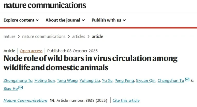 原文出处:Tu Z, Sun H, Wang T, Liu Y, Xu Y, Peng P, Qin S, Tu C, He B. Node role of wild boars in virus circulation among wildlife and domestic animals. Nat Commun. 2025 Oct 8;16(1):8938. doi: 10.1038/s41467-025-64019-4. PMID: 41062486; PMCID: PMC12508043.