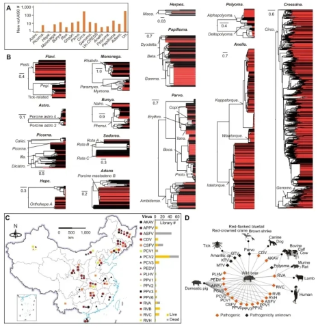 与家猪相比,BrCN-Virome显示出不同的病毒组组成,DNA病毒多样性显著增加。一些野猪病毒可追溯到人类、家畜、野生动物和节肢动物,其中一些病毒明显或潜在地与流行病或人畜共患病有关。猪病原体在野猪中广泛传播,是造成大量野猪死亡的原因,有时还会与多种非洲猪瘟病毒同时感染。这些结果表明,野猪是病毒循环网络中连接不同动物类群的节点动物,其携带的病毒不仅对养猪业构成重大威胁,而且对野生动物保护和公共卫生构成挑战,需要对野猪病毒进行常规监测,积极控制野猪种群。