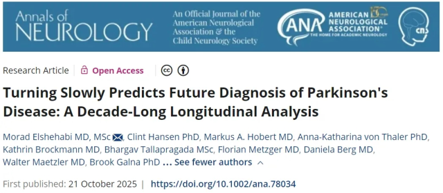 原文出处:Elshehabi M, Hansen C, Hobert MA, von Thaler AK, Brockmann K, Tallapragada B, Metzger F, Berg D, Maetzler W, Galna B. Turning Slowly Predicts Future Diagnosis of Parkinson's Disease: A Decade-Long Longitudinal Analysis. Ann Neurol. 2025 Oct 21. doi: 10.1002/ana.78034. Epub ahead of print. PMID: 41117503.