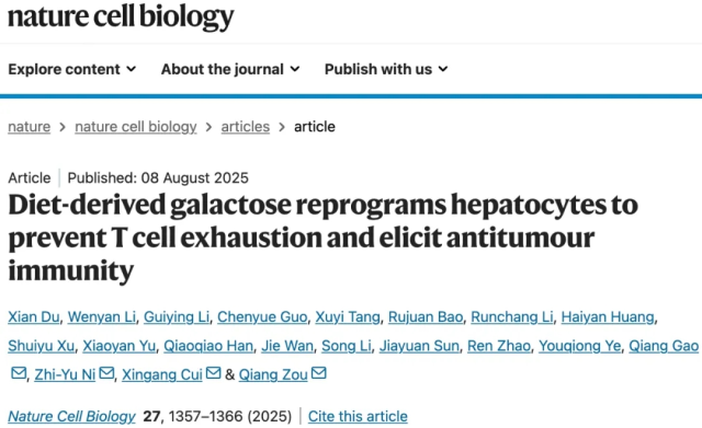 原文出处:Du X, Li W, Li G, Guo C, Tang X, Bao R, Li R, Huang H, Xu S, Yu X, Han Q, Wan J, Li S, Sun J, Zhao R, Ye Y, Gao Q, Ni ZY, Cui X, Zou Q. Diet-derived galactose reprograms hepatocytes to prevent T cell exhaustion and elicit antitumour immunity. Nat Cell Biol. 2025 Aug;27(8):1357-1366. doi: 10.1038/s41556-025-01716-8. Epub 2025 Aug 8. PMID: 40781141.
