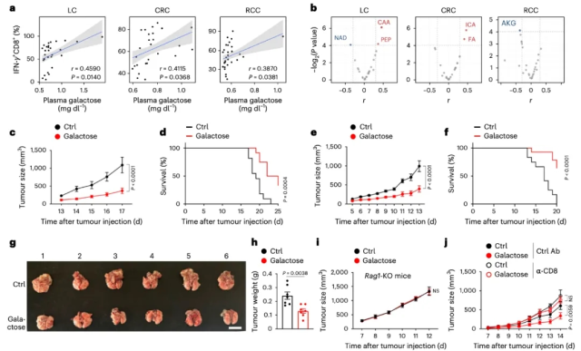 研究团队首先在肺癌、结直肠癌和肾癌患者中观察到一种现象:血液中半乳糖浓度较高的患者,其肿瘤组织内具有更强杀伤活性的干扰素-γ阳性CD8+T细胞也更多。这一相关性提示,半乳糖或许与抗肿瘤免疫存在某种隐秘的联系。