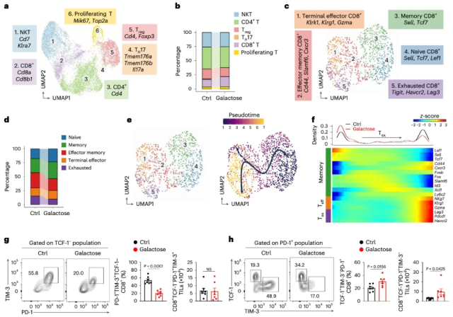为什么半乳糖能增强CD8+T细胞的战斗力?深入的细胞图谱分析发现,半乳糖喂养的小鼠,肿瘤中的CD8+T细胞更不容易进入“衰竭”状态。这些T细胞不是变得“懒散”,而是保持了“记忆”和“攻击”的潜能。