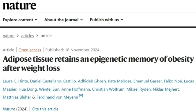 原文出处:Hinte LC, Castellano-Castillo D, Ghosh A, Melrose K, Gasser E, Noé F, Massier L, Dong H, Sun W, Hoffmann A, Wolfrum C, Rydén M, Mejhert N, Blüher M, von Meyenn F. Adipose tissue retains an epigenetic memory of obesity after weight loss. Nature. 2024 Dec;636(8042):457-465. doi: 10.1038/s41586-024-08165-7. Epub 2024 Nov 18. Erratum in: Nature. 2025 Jul;643(8073):E24. doi: 10.1038/s41586-025-08909-z. PMID: 39558077; PMCID: PMC11634781.