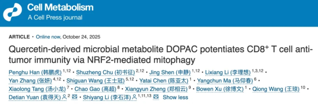 2025 年 10 月 24 日,山东大学齐鲁医院李石洋教授和山东大学基础医学院袁得天教授团队在 Cell 子刊 Cell Metabolism 上发表了题为:Quercetin-derived microbial metabolite DOPAC potentiates CD8⁺ T cell anti-tumor immunity via NRF2-mediated mitophagy 的研究论文。