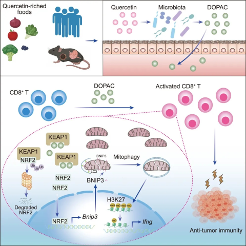 该研究发现,通过膳食(水果、蔬菜)摄入的槲皮素,会被肠道菌群代谢产生 3,4-二羟基苯乙酸(DOPAC),其通过 NRF2 介导的线粒体自噬,增强 CD8⁺ T 细胞的抗肿瘤免疫。这一发现强调了膳食营养素的微生物代谢产物在调控抗肿瘤免疫反应中的作用,表明了 DOPAC 是癌症免疫治疗的天然候选药物,且可与免疫检查点阻断(ICB)疗法联以进一步提高治疗效果。