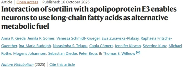 原文出处:Greda AK, Gomes JP, Schmidt-Krueger V, Zurawska-Plaksej E, Fritsche-Guenther R, Rudolph IM, Telugu NS, Cömert C, Kirwan J, Kunz S, Rothe M, Johannsen M, Diecke S, Bross P, Willnow TE. Interaction of sortilin with apolipoprotein E3 enables neurons to use long-chain fatty acids as alternative metabolic fuel. Nat Metab. 2025 Oct 16. doi: 10.1038/s42255-025-01389-5. Epub ahead of print. PMID: 41102453.