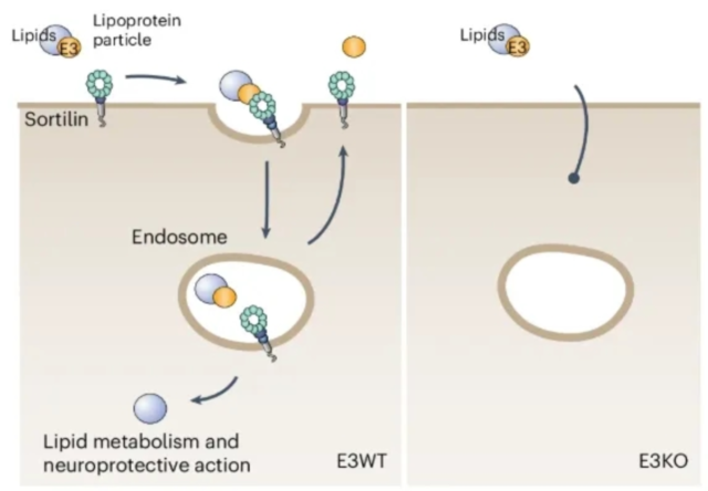 可 APOE4 这个 “坏变体” 会打乱这一切。研究团队用人源化小鼠(携带人类 APOE3 或 APOE4 基因)和诱导多能干细胞(iPS)培育的人类神经元、星形胶质细胞做实验发现:APOE4 会像 “卡住齿轮” 一样,阻止 sortilin 受体的回收——受体被卡在细胞内的早期内体里,没法回到细胞膜上继续 “签收” 脂质包裹。没有足够的脂质进入神经元,PPARα 就无法被激活,脂质代谢通路也成了 “摆设”。当葡萄糖供应减少时(比如衰老导致的大脑糖代谢下降),APOE4 携带者的神经元既用不好葡萄糖,又用不了脂质,只能陷入 “能量危机”,时间久了就容易出现功能衰退,这也解释了为何 APOE4 会让阿尔茨海默病风险足足升高 12 倍(纯合子携带者)。