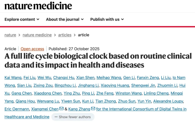 2025 年 10 月 27 日,温州医科大学/澳门科技大学张康教授团队与解放军总医院第一医学中心陈香美院士团队合作,在国际顶尖医学期刊 Nature Medicine 上发表了题为:A full life cycle biological clock based on routine clinical data and its impact in health and diseases 的研究论文。