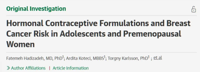 原文出处:Hadizadeh F, Koteci A, Karlsson T, Ek WE, Johansson Å. Hormonal Contraceptive Formulations and Breast Cancer Risk in Adolescents and Premenopausal Women. JAMA Oncol. 2025 Oct 30:e254480. doi: 10.1001/jamaoncol.2025.4480. Epub ahead of print. PMID: 41165687; PMCID: PMC12576617.