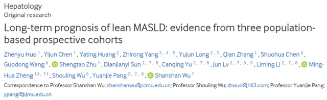 原文出处:Huo Z, Chen Y, Huang Y, Yang Z, Long Y, Zhang Q, Chen S, Wang G, Zhu S, Sun D, Yu C, Lv J, Li L, Zheng MH, Wu S, Pang Y, Wu S. Long-term prognosis of lean MASLD: evidence from three population-based prospective cohorts. Gut. 2025 Oct 15:gutjnl-2025-336127. doi: 10.1136/gutjnl-2025-336127. Epub ahead of print. PMID: 41093635.