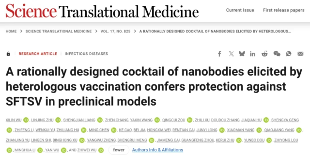 2025 年 11 月 19 日,南京大学医学院吴喜林教授团队联合大理大学吴稚伟教授、首都医科大学吴燕教授、清华大学娄志勇教授及中国科学院昆明动物研究所李明华研究员等,在 Science 子刊 Science Translational Medicine 上发表了题为:A rationally designed cocktail of nanobodies elicited by heterologous vaccination confers protection against SFTSV in preclinical models 的研究论文。