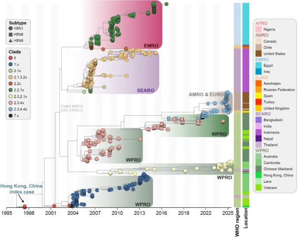 原文出处:Wei Wang, Jiabao Xing, Hui Jiang, Fayu Lu, Haoxuan Huang, Yuqian Zhang, Andi Sun, Yi Han, Jian Lu, Benjamin J Cowling, Peter Horby, Richard J Webby, Timothy M Uyeki, Hongjie Yu, Human infections with avian influenza a(H5) viruses with potential pandemic risk: 1997-2025, National Science Review, 2025;, nwaf471, https://doi.org/10.1093/nsr/nwaf471.
