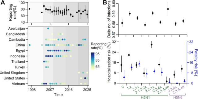 研究结果定量刻画了1997年人感染禽流感A(H5)病毒以来,病毒变异如何影响人群时空流行特征、临床严重程度和关键传播动力学参数的变化,强调了病例报告质量对理解人群真实的病毒感染发生风险和临床严重性的重要性。尽管目前禽流感A(H5)病毒的人际持续传播能力较低,但自2.3.4.4b分支在全球广泛流行以来,其跨宿主传播到人的风险显著提升,提示全球公共卫生领域应给予高度关注。相关结果也直接支撑禽流感A(H5)病毒引发大流行风险的评估和应急响应策略的制定。