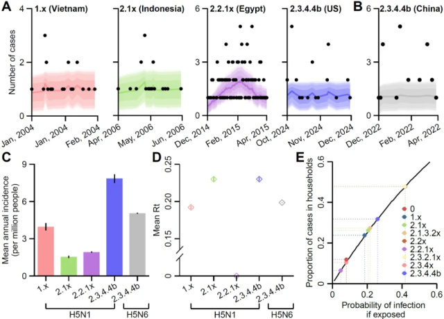 研究还发现,在1104例人感染禽流感A(H5)病例中[包括1009名A(H5N1)病例、88名A(H5N6)病例和7名A(H5N8)病例],87.8%的病例(N=969)发生在北半球国家,流行高峰集中在每年冬春季。相比A(H5N1)病例的全球广泛分布,A(H5N6)病例(中国:N=87,98.9%)和A(H5N8)病例(俄罗斯:N=7,100%)呈现高度区域性聚集。禽流感A(H5N1)病例的年龄(中位年龄:18岁,IQR:5-32岁)普遍低于A(H5N6)病例(中位年龄:50岁,IQR:35-57岁)和A(H5N8)病例(范围:29-60岁)。此外,自2.3.4.4b分支出现以来,病例主要感染来源由此前的后院家禽、活禽市场及其被污染的环境暴露(95.6-100%)转变为规模化养殖的禽类、奶牛暴露(92.8%,65/70)(p<0.001)。