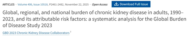 [1]GBD 2023 Chronic Kidney Disease Collaborators. Global, regional, and national burden of chronic kidney disease in adults, 1990-2023, and its attributable risk factors: a systematic analysis for the Global Burden of Disease Study 2023. Lancet. 2025 Nov 22;406(10518):2461-2482. doi: 10.1016/S0140-6736(25)01853-7. Epub 2025 Nov 7. PMID: 41213283.