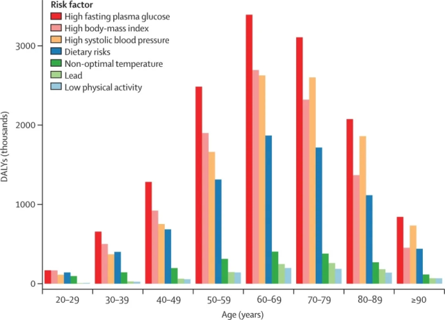 研究进一步明确了导致CKD疾病负担的主要风险因素。空腹血糖升高(导致31.9%)、收缩压升高(24.5%)、BMI升高(23.5%)、饮食风险(17.6%)和非适宜温度(4.4%)是导致CKD年龄标准化伤残调整寿命年(DALYs)的前五大风险因素。