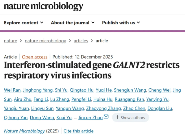 原文出处:Ran W, Yang J, Yu S, Hu Q, He Y, Wang S, Wei C, Sun J, Zhu A, Li F, Zhang L, Li P, Hu H, Pan R, Yu Y, Yuan Y, Sun L, Wang Y, Zhang Z, Chen Z, Liu D, Yan Q, Wang D, Yu K, Wang Y, Zhuo J, Zhuang Z, Tao H, Zeng Q, Zhou K, Chen F, Tang W, Zhou Y, Bai R, Xu Y, Li N, Dai J, Zhao H, Park JE, Wang T, Ding Q, Perlman S, Zhao J, Mao Y, Wang S, Zhao J. Interferon-stimulated gene GALNT2 restricts respiratory virus infections. Nat Microbiol. 2025 Dec 12. doi: 10.1038/s41564-025-02200-7. Epub ahead of print. PMID: 41387548.