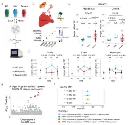 为了探究关键ISG表达水平与COVID-19严重程度的相关性,该研究团队首先整合COVID-19患者支气管肺泡灌洗液(BALF)和外周血单核细胞(PBMC)的单细胞RNA测序数据,综合数据分析发现,GALNT2在COVID-19轻症患者气道上皮细胞和恢复期PBMC中的表达水平显著高于重症患者,提示GALNT2表达水平与病毒清除和感染进程密切相关。随后,该团队进一步分析已公开的全基因组关联分析(GWAS)数据,研究人员发现携带GALNT2基因单核苷酸多态性(SNP)与COVID-19和IAV感染的易感性、严重程度、住院风险等高度相关(图1)。以上研究结果提示,GALNT2在病毒感染中可能发挥重要的抗病毒作用。
