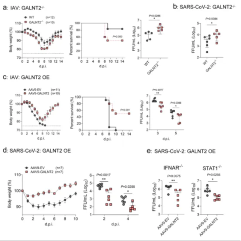 图2. GALNT2在体内保护小鼠拮抗SARS-CoV-2和IAV感染