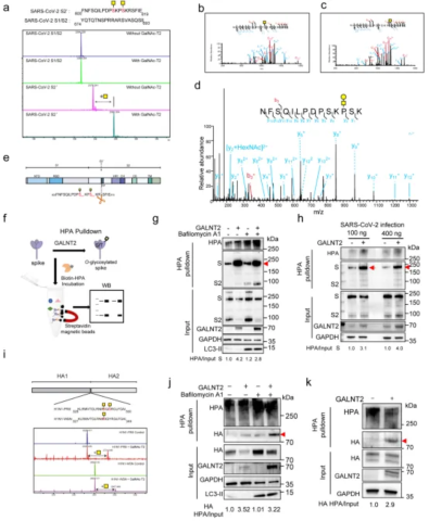 图3. GALNT2依赖的O-糖基化修饰SARS-CoV-2 Spike和IAV HA