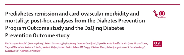 原文出处:Vazquez Arreola E, Gong Q, Hanson RL, Wang J, Sandforth L, He S, Sandforth A, Qian X, Giacca M, Bornstein SR, Fritsche A, Stefan N, Preissl H, Gregg EW, Marx N, Jumpertz-von Schwartzenberg R, Li G, Birkenfeld AL. Prediabetes remission and cardiovascular morbidity and mortality: post-hoc analyses from the Diabetes Prevention Program Outcome study and the DaQing Diabetes Prevention Outcome study. Lancet Diabetes Endocrinol. 2025 Dec 12:S2213-8587(25)00295-5. doi: 10.1016/S2213-8587(25)00295-5. Epub ahead of print. PMID: 41397402.