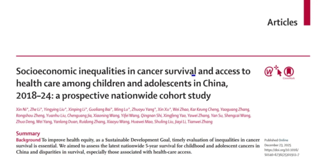 原文出处:Ni X, Li Z, Liu Y, Li X, Bai G, Lu M, Yang Z, Xu X, Zhao W, Cheng KK, Zhang Y, Zheng R, Liu Y, Jia C, Wang X, Wang Y, Shi Q, Yao X, Zhang Y, Su Y, Wang S, Deng Z, Yang W, Duan Y, Zhang R, Wang X, Mao H, Liu S, Li J, Zhang T. Socioeconomic inequalities in cancer survival and access to health care among children and adolescents in China, 2018-24: a prospective nationwide cohort study. Lancet. 2025 Dec 23:S0140-6736(25)01911-7. doi: 10.1016/S0140-6736(25)01911-7. Epub ahead of print. PMID: 41453383.