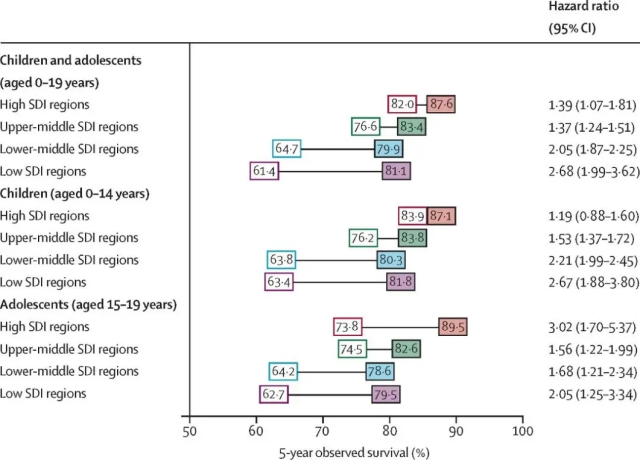癌症是导致全球儿童和青少年死亡的主要原因之一。尽管医疗进步已显著改善了儿童和青少年癌症患者的生存结局,但在不同社会经济背景下,癌症患者的生存仍存在差距。为实现可持续发展目标中的卫生公平,亟须及时评估癌症患者的生存状况,并深入分析与医疗保健可及性相关的生存差异。