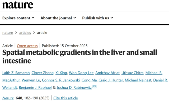 原文出处:Samarah LZ, Zheng C, Xing X, Lee WD, Afriat A, Chitra U, MacArthur MR, Lu W, Jankowski CSR, Ma C, Hunter CJ, Neinast M, Weilandt DR, Raphael BJ, Rabinowitz JD. Spatial metabolic gradients in the liver and small intestine. Nature. 2025 Dec;648(8092):182-190. doi: 10.1038/s41586-025-09616-5. Epub 2025 Oct 15. PMID: 41094143; PMCID: PMC12675281.