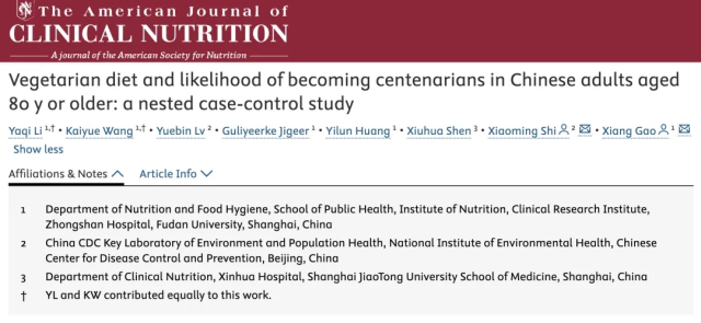 原文出处:Li Y, Wang K, Lv Y, Jigeer G, Huang Y, Shen X, Shi X, Gao X. Vegetarian diet and likelihood of becoming centenarians in Chinese adults aged 80 y or older: a nested case-control study. Am J Clin Nutr. 2025 Dec 12:101136. doi: 10.1016/j.ajcnut.2025.101136. Epub ahead of print. PMID: 41391640.