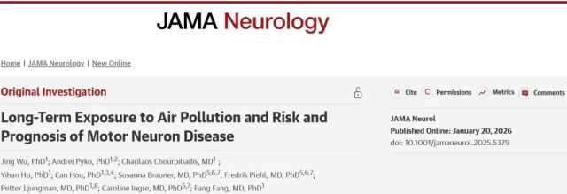 原文出处:Wu J, Pyko A, Chourpiliadis C, Hu Y, Hou C, Brauner S, Piehl F, Ljungman P, Ingre C, Fang F. Long-Term Exposure to Air Pollution and Risk and Prognosis of Motor Neuron Disease. JAMA Neurol. 2026 Jan 20:e255379. doi: 10.1001/jamaneurol.2025.5379. Epub ahead of print. PMID: 41557441; PMCID: PMC12820776.