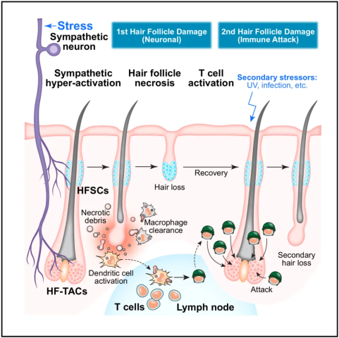 2025年11月26日,哈佛大学许雅捷(Ya-Chieh Hsu)团队在Cell 在线发表题为“Stress-induced sympathetic hyperactivation drives hair follicle necrosis to trigger autoimmunity”的研究论文,该研究表明急性压力触发快速脱发和启动自身免疫。