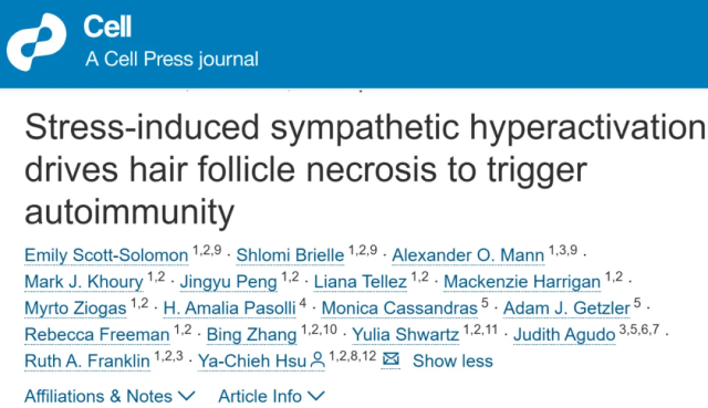 原文出处:Scott-Solomon E, Brielle S, Mann AO, Khoury MJ, Peng J, Tellez L, Harrigan M, Ziogas M, Pasolli HA, Cassandras M, Getzler AJ, Freeman R, Zhang B, Shwartz Y, Agudo J, Franklin RA, Hsu YC. Stress-induced sympathetic hyperactivation drives hair follicle necrosis to trigger autoimmunity. Cell. 2026 Jan 8;189(1):252-271.e19. doi: 10.1016/j.cell.2025.10.042. Epub 2025 Nov 26. PMID: 41308637; PMCID: PMC12668284.