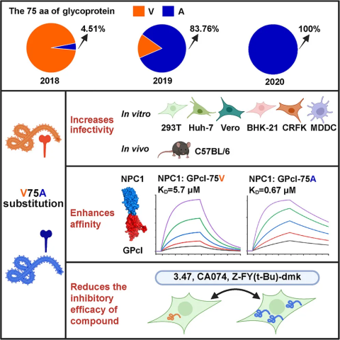 从机制上来说,GP-V75A 增强了病毒糖蛋白(GP)与宿主受体 NPC1 的结合亲和力,并降低了对内体半胱氨酸蛋白酶介导的入侵的依赖性。值得注意的是,GP-V75A 还显著降低了靶向 NPC1 的化合物和中和抗体的效力。流行病学分析表明,GP-V75A 的流行率上升与疫情暴发期间病例数量的增加相吻合。