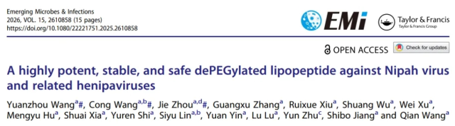 原文出处:Wang Y, Wang C, Zhou J, Zhang G, Xiu R, Wu S, Xu W, Hu M, Xia S, Shi Y, Lin S, Yin Y, Lu L, Zhu Y, Jiang S, Wang Q. A highly potent, stable, and safe dePEGylated lipopeptide against Nipah virus and related henipaviruses. Emerg Microbes Infect. 2026 Dec;15(1):2610858. doi: 10.1080/22221751.2025.2610858. Epub 2026 Jan 12. PMID: 41459801; PMCID: PMC12798670.