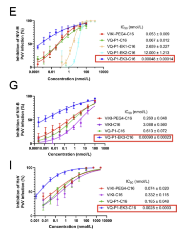 优化获得的脂肽VQ-P1-EK3-C16在体外实验中表现卓越。其对尼帕病毒马来西亚株(NiV-M)假病毒感染的半数抑制浓度(IC50)达0.48 pM,对尼帕病毒孟加拉株(NiV-B)和亨德拉病毒(HeV)同样高效,显示出广谱抗亨尼帕病毒活性。值得关注的是,其体外抗病毒活性相较于目前已完成I期临床试验抗NiV抗体m102.4的抗尼帕病毒活性 (IC50=0.27 nM,PMID: 18271743) 强562倍。