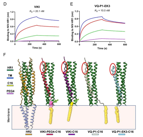 在新生小鼠感染模型中,该脂肽能有效抑制NiV-M假病毒肺部与脑部感染,并显示出跨血脑屏障的能力,提示其对病毒性脑炎具有治疗潜力。机制研究表明,该脂肽能以高亲和力与NiV-HR1结合,阻断6-HB的形成。