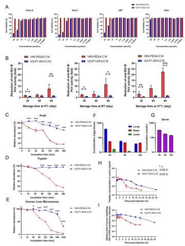 此外,VQ-P1-EK3-C16展现出优异的成药特性:在37℃储存90天后活性仅轻微下降;对蛋白酶降解具有强抵抗力;在动物体内血清半衰期近6小时,且静脉注射24小时后血药浓度仍维持超高抑制水平;细胞毒性低,选择(或治疗)指数(SI)超高。