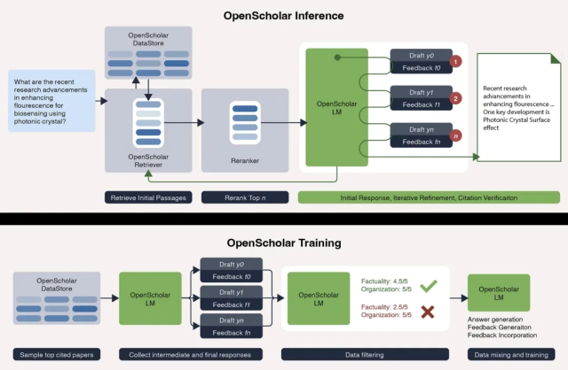 OpenScholar 推理(上)和训练流程(下)