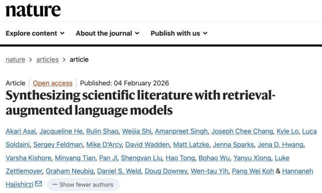 原文出处:Asai A, He J, Shao R, Shi W, Singh A, Chang JC, Lo K, Soldaini L, Feldman S, D'Arcy M, Wadden D, Latzke M, Sparks J, Hwang JD, Kishore V, Tian M, Ji P, Liu S, Tong H, Wu B, Xiong Y, Zettlemoyer L, Neubig G, Weld DS, Downey D, Yih WT, Koh PW, Hajishirzi H. Synthesizing scientific literature with retrieval-augmented language models. Nature. 2026 Feb 4. doi: 10.1038/s41586-025-10072-4. Epub ahead of print. PMID: 41639446.
