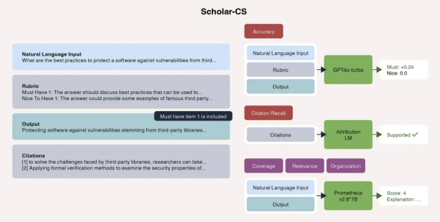 与以往只关注选择题或短答案的基准不同,ScholarQABench 引入了多维评估协议,包括自动指标(例如引用准确性)和人类专家基于量表的评分(覆盖范围、连贯性、写作质量等)。例如,在“计算机科学”部分中,专家会列出答案必须包含的关键要点,AI 的回答需要满足这些“评分标准”才能得分。