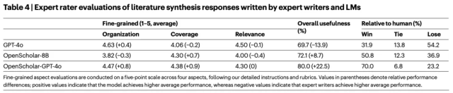 - 引用准确性:OpenScholar 的引用 F1 分数达到 47.9%,而 GPT-4o 几乎为 0。