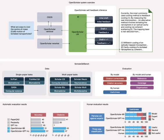 OpenScholar 是一个检索增强的语言模型(Retrieval-Augmented Language Model),它能够从 4500 万篇开放获取(Open Access)论文中智能检索相关段落,生成带引用的长篇综述论文(涵盖计算机科学、物理学、神经科学和生物医学领域),其引用准确率与人类专家相当,并在多项测试中超越了 GPT-4o 等主流大模型。更令人惊喜的是,研究团队全面开源了 OpenScholar,为科研社区提供了一个透明、可复现的工具。