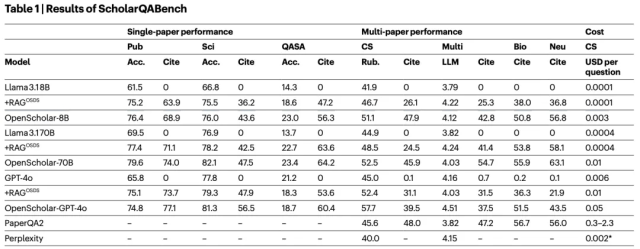 - 成本效益:使用高效的检索管道,OpenScholar-8B 的成本比基于 GPT-4o 的商业系统更低。
