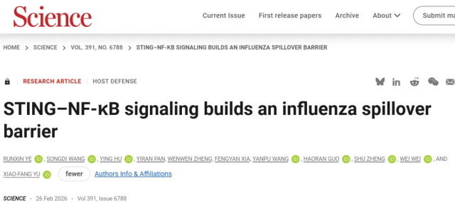 原文出处:Ye R, Wang S, Hu Y, Pan Y, Zheng W, Xia F, Wang Y, Guo H, Zheng S, Wei W, Yu XF. STING-NF-κB signaling builds an influenza spillover barrier. Science. 2026 Feb 26;391(6788):eads4405. doi: 10.1126/science.ads4405. Epub 2026 Feb 26. PMID: 41747053.