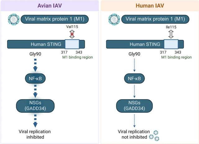 对 IAV 编码蛋白的检测表明,人类 IAV 编码的基质蛋白 1(M1)蛋白能够介导对人类 STING–NF-κB–GADD34 通路的逃避。该研究发现,来自禽类 IAV 的 M1 蛋白在对抗人类 STING 方面的效果不如人类 IAV 的 M1 蛋白,尽管它对禽类 STING 仍具有完全的活性。序列比对发现 M1 蛋白第 115 位存在一个缬氨酸到异亮氨酸的替换,这一替换使得它能够特异性地逃避人类 STING(而非禽类 STING),从而增强了禽类特征的 IAV 在哺乳动物细胞中的复制能力。